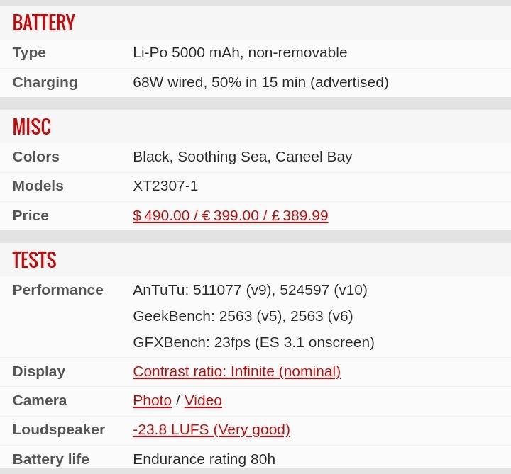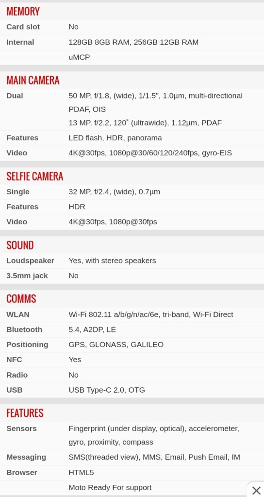 ফটোগ্রাফির জন্য, ফোনটির পিছনে একটি ডুয়াল ক্যামেরা সেটআপ রয়েছে। এতে একটি 50-মেগাপিক্সেল প্রাথমিক সেন্সর এবং অটোফোকাস সাপোর্ট সহ একটি 13-মেগাপিক্সেল আলট্রা-ওয়াইড লেন্স রয়েছে। সেলফি এবং ভিডিয়ো কলিংয়ের জন্য, ফোনটিতে একটি 32-মেগাপিক্সেল ক্যামেরা রয়েছে, যা কেন্দ্রে পাঞ্চ-হোল কাটআউট দেওয়া হয়েছে। Moto-এর এই নতুন 5G ফোনে কানেক্টিভিটির জন্য WiFi 6E, Bluetooth 5.3, GNSS, NFC এবং USB Type-C রয়েছে। ফোনটিতে 68W ফাস্ট চার্জিং সাপোর্ট সহ 5000mAh ব্যাটারি রয়েছে।